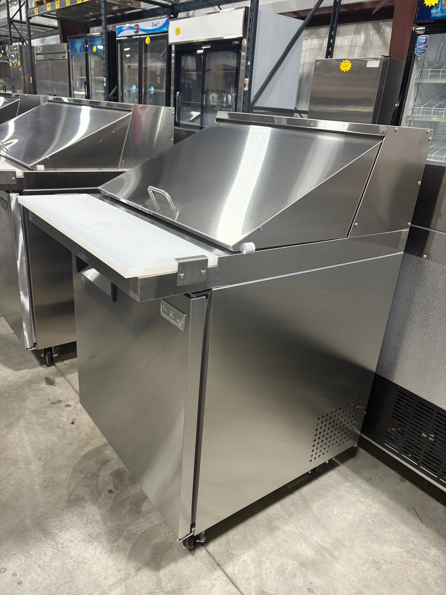 27" Mega top Prep Station. Runs on 110v electric. Great for sandwich prep. Stainless steel interior and exterior. Self closing doors with 90 degree stay-open feature. Adjustable heavy-duty PVC coated shelves. Pans and cutting board included. Electronic control system makes it easy to adjust temp settings. pre-installed heavy duty casters with brakes. R290 refrigerant.
