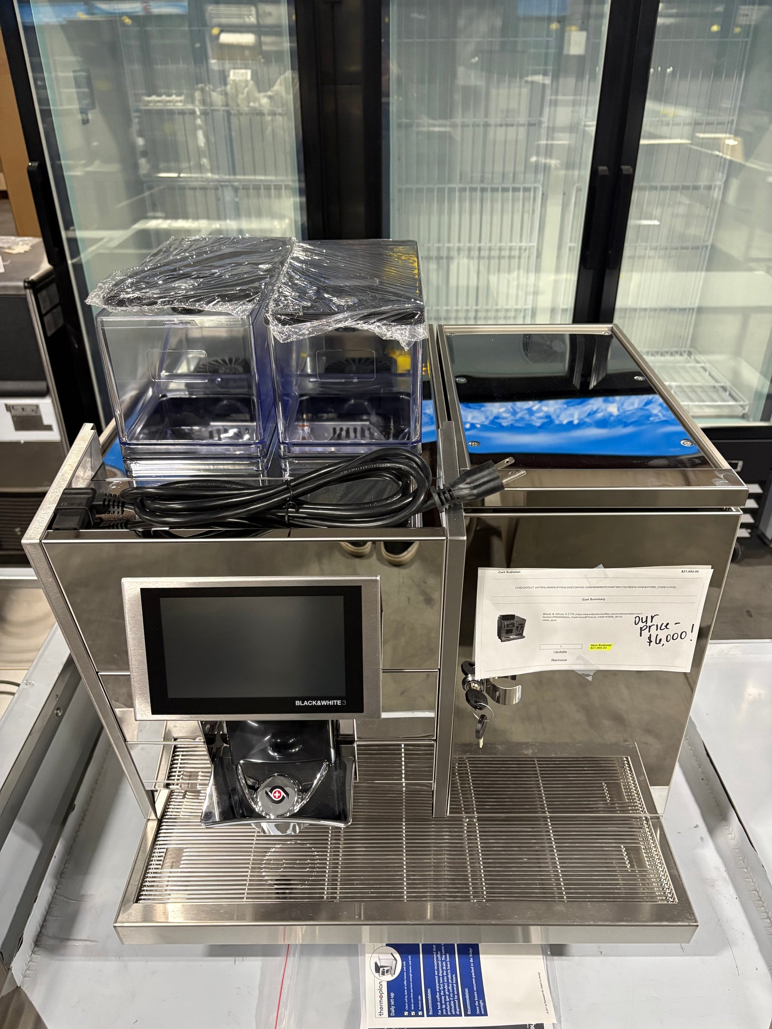 -Has 2 3.3lb espresso bean hoppers and a 1.3gal milk refrigerator.