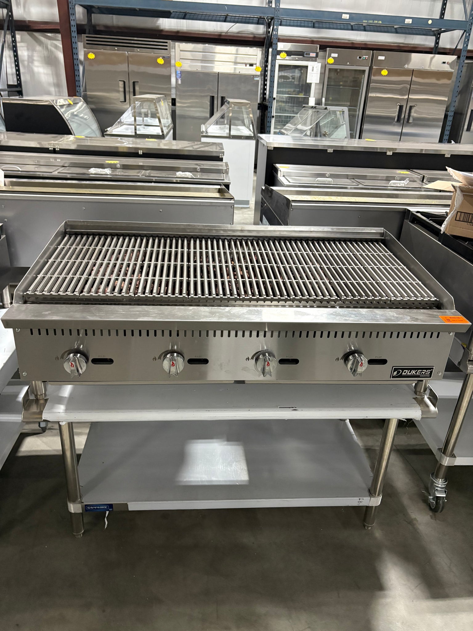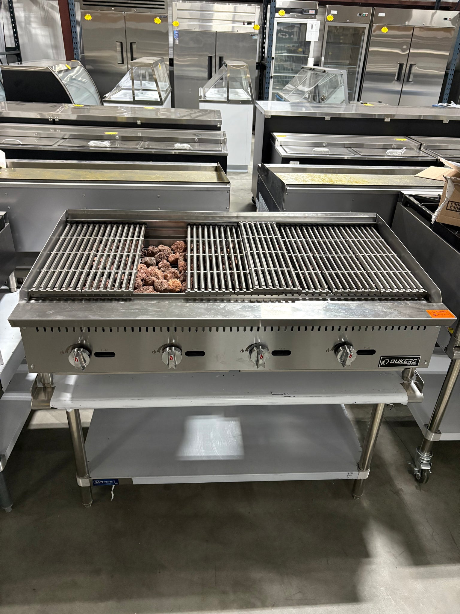 The Dukers DCRB48 is a versatile 48-inch countertop charbroiler engineered to meet the rigorous demands of commercial kitchens. Crafted with a durable stainless steel exterior and interior, paired with double wall sides and adjustable stainless steel legs featuring non-skid feet, it guarantees both durability and stability. With four 35,000 BTU burners per 12-inch section equipped with standby pilots and independent manual controls, it offers precise heat management for diverse cooking needs. Featuring a full-width crumb tray for effortless cleaning and a "cool-to-the-touch" front stainless steel edge for enhanced safety, it prioritizes user convenience. Available in both natural gas and propane options, with an included LP conversion kit, it provides flexibility for various kitchen setups. Supported by a 1-year parts and labor warranty, this charbroiler ensures reliability and performance, making it an excellent choice for culinary professionals seeking high-quality grilling equipment.